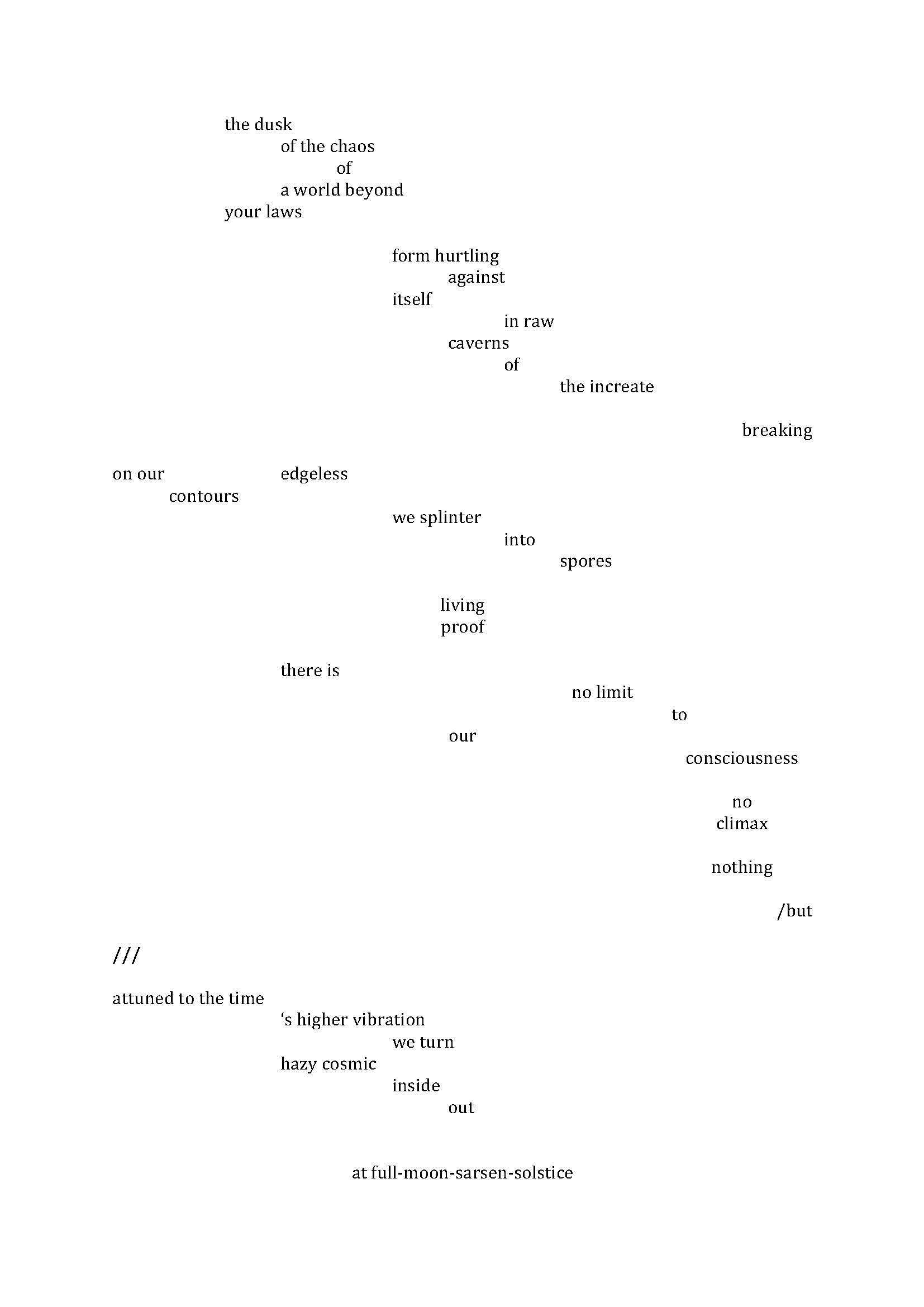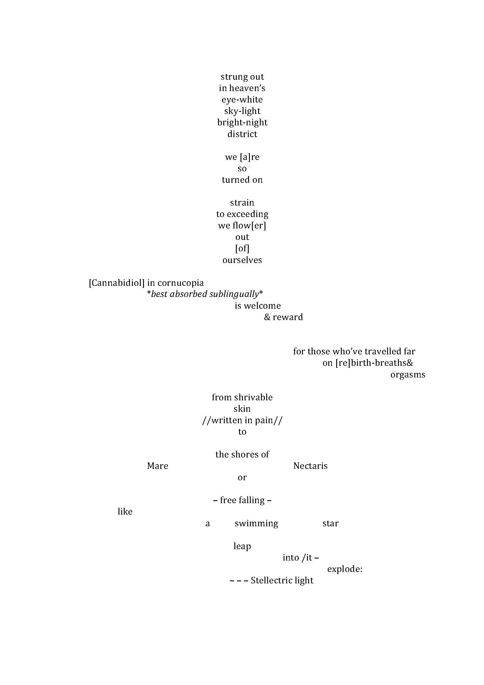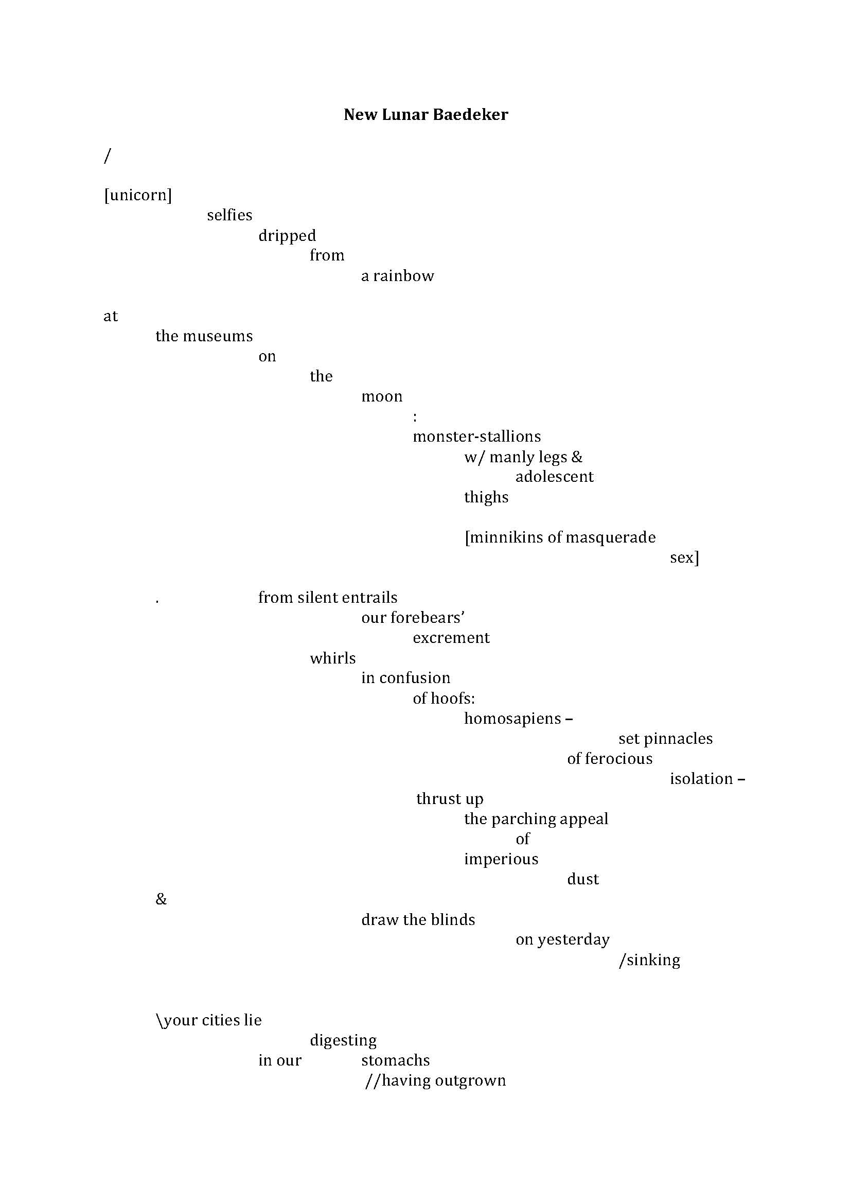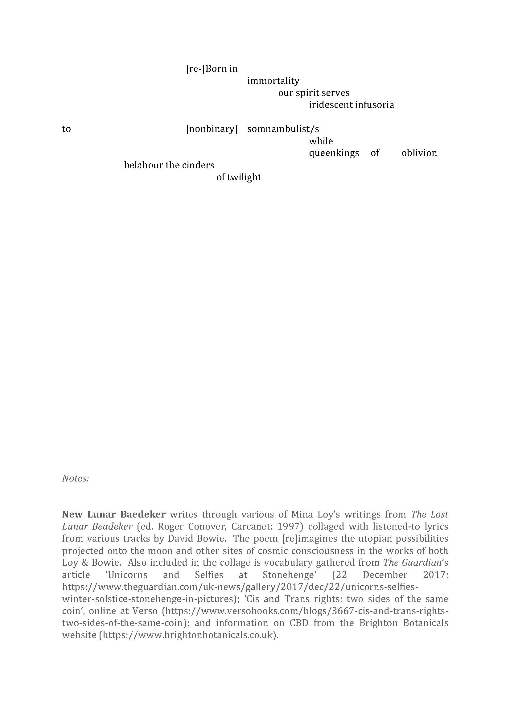 New Lunar Baedekerwrites through various of Mina Loy’s writings from The Lost Lunar Beadeker(ed. Roger Conover, Carcanet: 1997) collaged with listened-to lyrics from various tracks by David Bowie. The poem [re]imagines the utopian possibilities projected onto the moon and other sites of cosmic consciousness in the works of both Loy & Bowie. Also included in the collage is vocabulary gathered from The Guardian’s article ‘Unicorns and Selfies at Stonehenge’ (22 December 2017: https://www.theguardian.com/uk-news/gallery/2017/dec/22/unicorns-selfies-winter-solstice-stonehenge-in-pictures); ‘Cis and Trans rights: two sides of the same coin’, online at Verso (https://www.versobooks.com/blogs/3667-cis-and-trans-rights-two-sides-of-the-same-coin); and information on CBD from the Brighton Botanicals website (https://www.brightonbotanicals.co.uk).