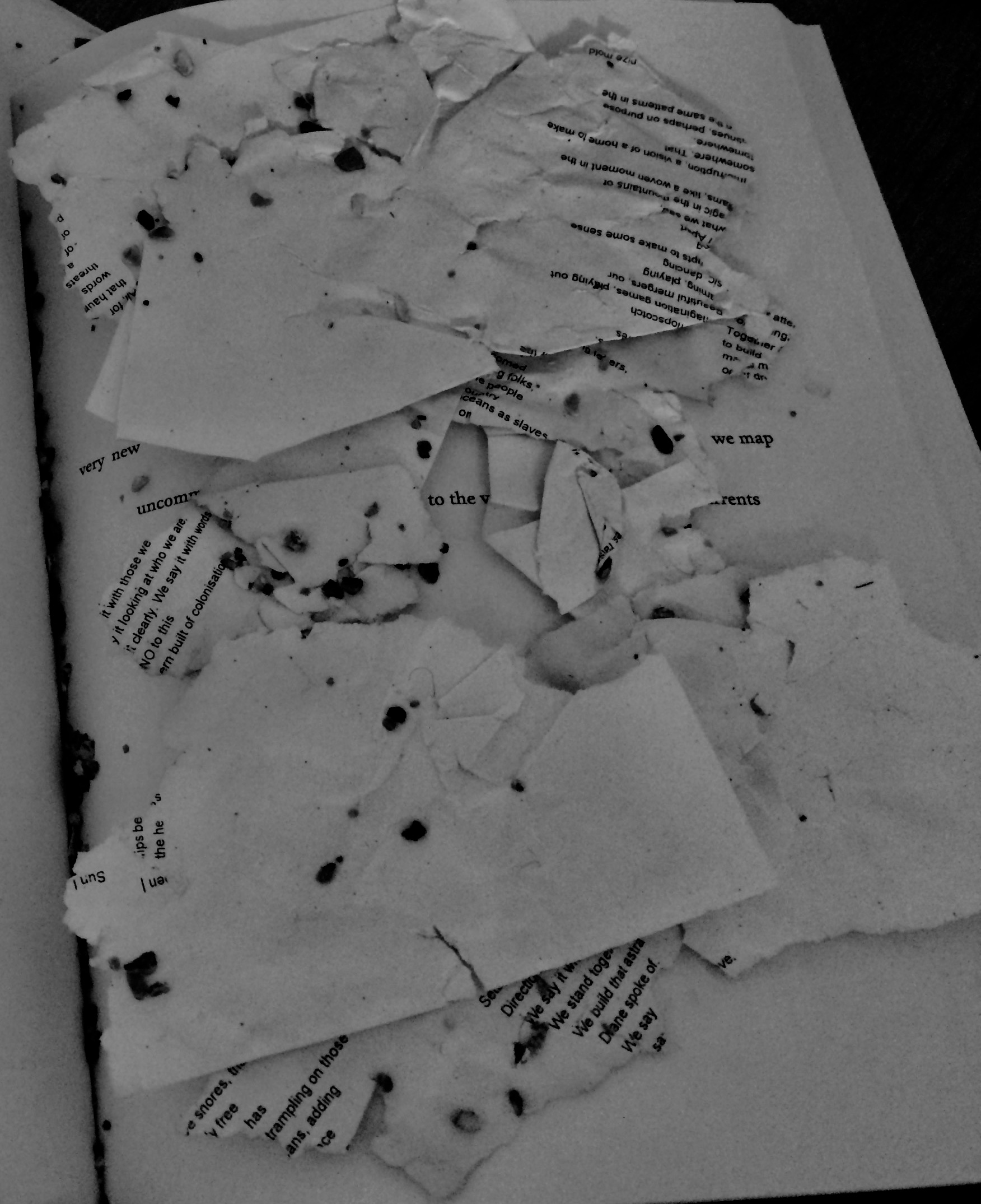At the end of the ritual, we took each other’s poems home to remix in collaboration with one another and the elements, mindful of the presence of the duppies in Nourbese Philip’s Zong!. I carried Dolly’s poem, folded into the pages of my copy of Zong! where it dried, and created my dub remix from the remains. Dolly did the same to mine.